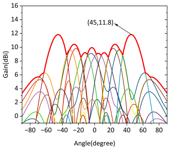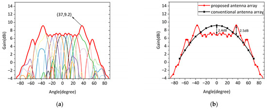 We compared the detection range at 37° between our antenna array and a conventional antenna array. The increase in detection range at ±37° can be calculated using the radar range equation. A comparison with a conventional phased array of equivalent peak gain, as shown by the red curve in Figure 8, shows a 2.5 dB increase in gain at the largest beam deflection angle of ±37°. Based on the functional relationship between detection range and antenna gain in the radar equation,