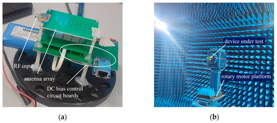 Measurement setup of the antenna array: (a) antenna array connected to the DC bias control boards and mounted on a platform using nylon standoffs; (b) measurement inside an anechoic chamber.
