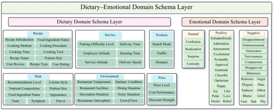 The design of the schema layer forms the foundation of knowledge extraction. Existing studies generally categorize schema layers into the following four categories: top-level ontology, domain ontology, task ontology, and application ontology. Based on an analysis of the characteristics of dietary reviews, the schema layer for dietary knowledge tends to align more closely with task or application ontology. For example, Zhao et al. [] constructed a health-domain schema layer grounded in the entity attributes and relationships related to food. From the perspective of user needs, Cui [] selected common edible flower recipes with health benefits and developed an ontology model focused on flower recipes possessing these benefits. Through an analysis of data from health and food websites, Yuan [] employed a top-down approach to construct a diet-domain schema layer. Huang [] integrates traditional Chinese medicine concepts, such as “medical-food homology”, with modern nutrition science, employing a seven-step methodology to represent and model a healthy-diet-domain ontology. This ontology has also found application in medicine and related fields. The construction of the aforementioned schema layers largely overlooks the rich emotional information embedded in the reviews, making it difficult to capture a user’s subjective experience and preference. Zheng et al. [] derived an emotional hierarchy of needs for the slimming population based on their characteristics, integrating emotional information analysis. References [,] incorporate emotion into the objective descriptions of restaurants and service quality, including aspects such as service attitude, restaurant facilities, and location []. However, further analysis reveals that the existing research rarely correlates subjective and objective information simultaneously or extracts multi-knowledge to support more downstream tasks. Additionally, current emotional knowledge bases lack coverage of emergent online emotional expressions and negative terms, such as emoticons and “Yanti” characters. Therefore, considering the rich emotional content and diverse expression in online dietary reviews, this paper combines emotional and dietary features to construct a two-dimensional professional dietary–emotional schema layer. This framework enables knowledge extraction that better integrates subjective and objective information while maintaining strong scalability.