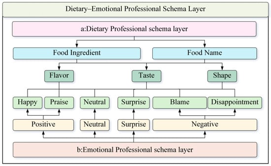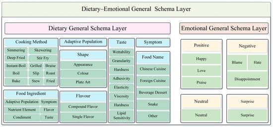 Based on the concepts illustrated in Figure 1, this paper constructs the following two complementary schema layers for dietary–emotional knowledge extraction: the domain schema layer (e.g., Figure 2) and the general schema layer (e.g., Figure 3). The domain schema layer is developed by synthesizing authoritative academic research in the dietary field [,,,,,,,]. However, this layer mainly addresses objective information about diets and does not incorporate emotional aspects. Due to the strong reliance on manual labor, the domain schema layer construction is not well suited for large-scale data processing. In contrast, the general schema layer is data-driven. It involves manually summarizing and organizing knowledge elements directly from the data, abstracting them into conceptual schemas. However, this approach may impact the accuracy of the extracted concepts because of the uneven quality of the underlying data. To address this issue, this paper first constructs a dietary–emotional domain schema layer based on professional knowledge. Subsequently, it abstracts the relevant concepts from the real-time review datasets collected from platforms such as Meituan and Dianping to form a general schema layer. During this process, the domain schema layer serves as a standardizing framework for concepts, while the concepts derived from the general schema layer are used to enrich and supplement the domain schema. By combining these two approaches, a professional and practical dietary–emotional schema layer—referred to as the professional dietary–emotional schema layer—is created (illustrated in Figure 4). The knowledge base structure developed under the guidance of this schema exhibits clear hierarchy, low redundancy, and rich diversity.