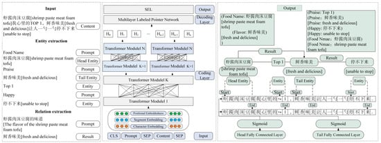 When using traditional models for information extraction, each extraction task requires dedicated input structures, making the process cumbersome and time-consuming. In contrast, the UIE framework enables modeling of diverse information extraction tasks in a unified manner, facilitating a seamless text-to-structure conversion across different tasks []. This capability is realized through the following two key components: the Structured Schema Instructor (SSI) and Structured Extraction Language (SEL). The SSI decomposes the information extraction task into fundamental elements, spotting and associating, which are then used to construct a tailored prompt for the extraction task. This prompt design within SSI is crucial for enabling the UIE model to effectively extract knowledge across diverse tasks. The dietary–emotional knowledge joint extraction model based on the UIE framework, as proposed in this paper, is illustrated in Figure 5.