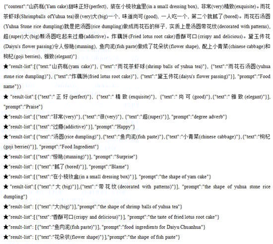 In recent years, deep learning technologies, especially pre-trained language models based on the Transformer architecture, have made breakthrough progress in the field of natural language processing. These techniques have demonstrated significant advantages in knowledge extraction tasks, gradually replacing traditional rule-based and statistical machine learning-based methods and becoming the mainstream paradigm in current knowledge extraction research [,,]. For example, Reference [] mentions an entity recognition algorithm that combines a domain-specific dictionary with a conditional random field (CRF) model, which enhances the quality of entity extraction to a certain extent. Li [] introduce an attention mechanism into the BERT-BiLSTM-CRF model for named entity recognition on a Chinese dietary culture dataset, achieving promising results. Reference [] employs a weakly supervised learning approach to extract relationships from heterogeneous, large-scale data. Although these methods achieve knowledge extraction in the dietary domain, all rely heavily on extensive annotated datasets for training, which remains time-consuming and labor-intensive. In addition, the number of dietary labels in reviews is extensive, whereas the distribution of subjective emotion labels is sparse. This imbalance adversely affects the performance of knowledge extraction models. Through research and analysis, data-enhanced few-shot learning methods have been shown to effectively address this issue, with several relevant studies reported in the literature []. Among these, the few-shot learning methods based on data synthesis [] and feature enhancement [] demonstrate greater flexibility and applicability. Therefore, to tackle the feature content imbalance problem in online dietary review texts, this paper proposes a novel doubly constrained dataset optimization approach that integrates both data synthesis and feature enhancement techniques. Firstly, the data synthesis method is employed to moderately increase both the quantity and diversity of few-shot optimization datasets, thereby enabling the model to better capture the semantic features of the sentence. Secondly, the feature enhancement technique is applied to balance the distribution of sample categories within the optimized dataset, mitigating model bias caused by class imbalance. As a result, the fine-tuned UIE model trained on this optimized dataset significantly improves learning and recognition performance, achieving multivariate, multi-task knowledge extraction of dietary attributes and emotions. This advancement also establishes a solid data foundation for the construction of a comprehensive multivariate emotional knowledge base.