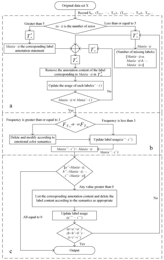 The main ideas are the following: Let X denote the original dataset and Tm represent the annotated sentences within X. The frequency and content of each label in every sentence of (X) are recorded. The dietary–emotional schema is defined as Sn(n = 1···9), where the value of the parameter n from 1 to 9 represents the food name, food ingredient, degree adverb, surprise, happy, praise, neutral, blame, and disappointment labels, in order. Based on Sn, set Tma,…, Tmi as the number of annotations for a certain label in the m-th sentence. TmA,…, TmI is the content of a certain label in the m-th sentence. Tma···i is the number of annotations for each label in the m-th sentence. To balance the number of each label in the dataset, the optimization process is divided into three steps, as follows.