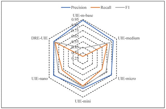 From Table 4 and Figure 8, it is evident that the fine-tuned DRE-UIE model achieves the highest F1 score, indicating that it has the best overall performance. This advantage stems from the DRE-UIE model’s larger parameter scale and deeper network structure compared to the media, micro, mini, and nano models. Specifically, its multi-head self-attention layers enable more effective capture of long-range dependencies and the global contextual information within the textual sequences. This enhances the ability to aggregate and interact with input features makes the DRE-UIE model the preferred knowledge extraction model in this study.