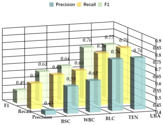 To further validate the superior performance of DRE-UIE model in dietary–emotional knowledge extraction, it was fine-tuned and experimentally compared with the SOTA models, including TENER, using 100 original datasets. Each SOTA model compared has its own characteristics in semantic understanding, feature extraction, and sequence annotating tasks. Their experimental results are shown in Table 5, and the corresponding visualizations are shown in Figure 9.