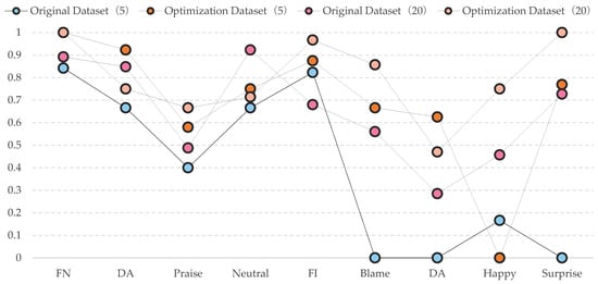 Table 6 reveals consistent performance improvements with increasing sample sizes across both datasets, likely attributable to enhanced feature learning and dietary–emotional semantic understanding. However, as shown in Table 6 and Figure 10, when the number of samples reaches 20-shot, the recognition performance of the model does not improve due to the increase in the number of samples and determines the optimal number of samples for few-shot learning of the DRE-UIE model. This experiment thus identifies 20-shot as the optimal sample size for few-shot learning in the DRE-UIE model. Table 7 shows that on the original dataset, DRE-UIE achieves a high recognition rate for the five labels of ingredients, food name, praise, blame, and neutral emotion, whereas the recognition rates for other emotion labels remain relatively low. The reason is that these labels are annotated with a lot of content and distinctive features, which makes it easy for the model to understand and distinguish such labels. Otherwise, the opposite happens. To evaluate the few-shot learning capability of the DRE-UIE model, 5-shot and 20-shot are conducted. At 5-shot on the original dataset, the model’s recognition rates for disappointment, surprise, and disparagement are effectively zero, with only poor performance for the praise emotion type. The sparse distribution of these emotions hinders the model’s capacity to learn and recognize them. In contrast, when using an equivalent number of optimized data samples, the recognition metrics for these emotions improved markedly, as follows: praise is improved by 18%, disparagement and disappointment increased by about 60%, surprise by 76%, and neutral by 9%. These results, illustrated in Figure 10, demonstrate the effectiveness of our dataset optimization method in mitigating data scarcity problems.