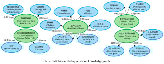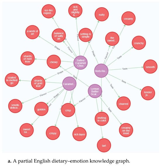 From the experimental results in Table 9, it can be seen that the model achieves comparable recognition performance on both Chinese and English corpora, demonstrating strong robustness and generalization capabilities across languages. The possible reasons are as follows: firstly, the original data in Chinese and English used in the experiments are of high quality, providing reliable training and evaluation material. Secondly, the model is effectively designed to handle textual inputs from different languages. Thirdly, the prompt designed for the text features of food reviews in this paper exhibit a high degree of universality. After knowledge extraction and knowledge cleaning of 50,000 Chinese corpora and 1,000,000 English corpora, along with the collection of expressions and kaomoji and the construction of sentiment lexicons, a multivariate dietary–emotional knowledge base was formed. This knowledge base includes 300,000 Chinese triples, 4,960,000 English triples, 1073 expressions, 489 kaomoji, sentiment lexicons containing six emotions each for both Chinese and English, and a total of 1,510,000 emotional words. The dietary–emotional multivariate knowledge base is shown in Figure 11. To demonstrate the associations within the knowledge more intuitively, a knowledge graph is used to for visualization. Part of the knowledge graph is shown in Figure 12, including the Chinese knowledge graph (a) and the English knowledge graph (b).