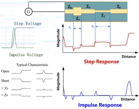 Time domain reflectometry (TDR) is the most widely used technique for evaluating discontinuity problems within medium voltage cables []. There are two types of TDR instruments, i.e., the impulse and step type, as shown in Figure 1. Impulse type TDR sends a voltage pulse with an adjustable width into the test object, while step TDR injects a voltage step with a fast rise time. A reflection will be seen if there is any impedance change within the test object. Impulse type TDR instruments are more frequently used in field applications. Commercial TDR instruments can output a voltage pulse with ca. 100 V magnitude and 20 ps–10 ns pulse width. Previous research has investigated transformer winding fault evaluation using the TDR technique. The effectiveness of the winding fault located using a fast-rising step voltage has been successfully verified by the simulation []. The voltage pulse method also worked well for locating the inter-turn fault in a simple winding sample []. There was an attempt to combine the advantages of SFRA and TDR methods for easier and more reliable detection and localization of the faults in transformer windings []. The TDR result was more intuitive but could be disturbed by the inhomogeneity winding structure and strong signal distortion. However, the authors still believed that certain approaches could solve these problems.