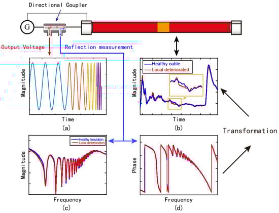 FDR principle: (a) VNA output—a series of sinusoidal voltages at various frequencies; (b) final results—time–magnitude trace; (c) reflection coefficient—magnitude; (d) reflection coefficient phase.