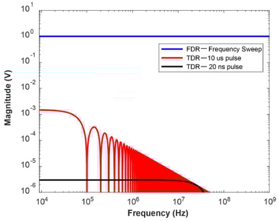 where is the propagation speed for the test object (expressed as a faction of the light speed ), is the bandwidth of the measurement, and is the number of sweep points. The spectrums of the FDR output and two TDR pulses with a pulse width of 20 and 10 , respectively, are shown in Figure 3. The equivalent voltage magnitude and energy of the FDR output are much higher.