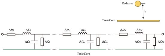 The transformer winding structure is illustrated in Figure 4. Each disk contains a number of turns. An infinitesimal length can be modeled as a lumped-element circuit, which is then cascaded to the actual winding length, as shown in Figure 5. The winding conductor has a weak coupling with the tank/ground. So, the circuit elements are determined by the wire over a ground plane model [].