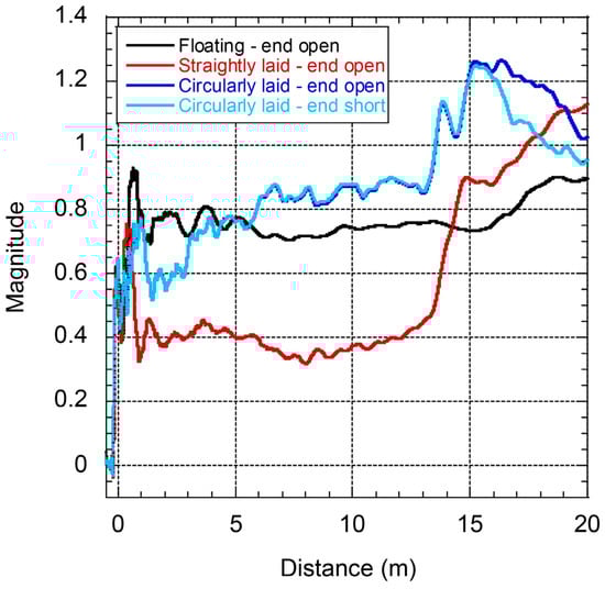 The FDR results of the core-to-ground measurements are shown in Figure 7. The wave propagation speed was set to 195 m/μs so that the measured length was equal to 16 m (physical length) when the cable was floating. The reflections at the start and end terminal are easy to distinguish. When the cable is straightly laid on the foil, the turn-to-ground capacitance increases and the wave impedance is reduced. The reflection magnitude differences between the terminals and cable body become more prominent. The circularly laid cable was measured twice with the end terminal open and short to ground, respectively, so that the end could be better presented. The pattern changed considerably compared to the prior cases. The good news is that the wave propagation speed was consistent in three setups, as the measured lengths were almost identical. As a result, condition evaluation can be achieved by comparing over time or with a similar object. Fault locating accuracy is not affected by the turn-to-turn capacitance.