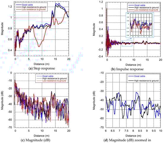 The high and low resistance to ground faults were created to study their impacts on FDR results: the step response, impulse response, and magnitude (dB). The magnitude of the step response shown in Figure 8a dropped dramatically when the low resistance to ground fault was present. The high resistance to the ground fault introduced a slight but consistent magnitude drop from the fault point to the end. The patterns of the impulse response in Figure 8b were quite difficult to observe. The fluctuation of the healthy part could be more than the pattern change caused by faults. For the magnitude (dB) results in Figure 8c, the low resistance fault increased the magnitude and changed the pattern in the fault area. The high resistance fault does not change the magnitude much but causes the distance shift in peaks and valleys. One can observe the high resistance fault by zooming in on the adjacent fault area, as shown in Figure 8d. The lab experiments have shown that the magnitude (dB) trace is able to present a 2 MΩ resistive fault. The detection sensitivity is better if a fault causes the local capacitance or inductance change.