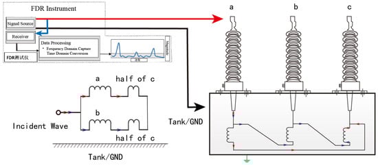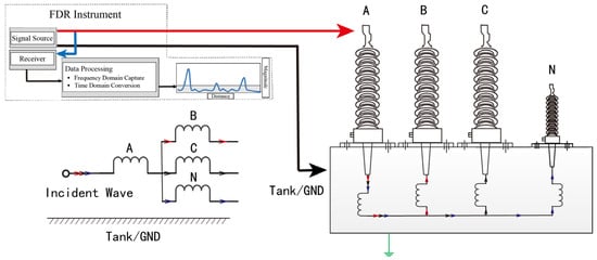 The connection of the HV winding (star-connected), Phase A, is shown in Figure 9. The instrument injected a series of sinusoidal voltages (3–5 Vpp) to the test object. The test signal was applied to the phase winding conductor and tank (ground). The incident wave first passed through the Phase A winding conductor, then to the parallel windings of Phase B and C that were connected with the neutral (N). The other two phases were tested by connecting the red clip to the corresponding winding terminal.