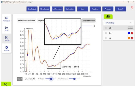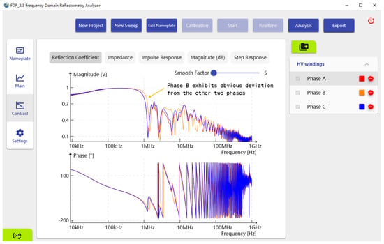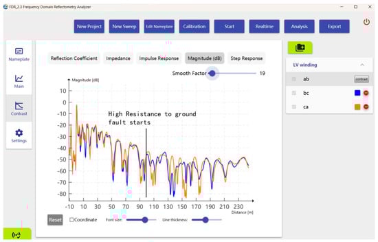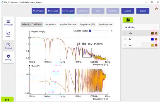 The FDR results are shown in Figure 15 and Figure 16. Only two traces were selected for comparison: connecting to the phase b terminal gave the response of the phase b winding in parallel with the phase c winding; connecting to the phase c terminal gave the response of the phase c winding in parallel with the phase a winding. The comparison of the two selected traces was equivalent to comparing phase a and b windings.
