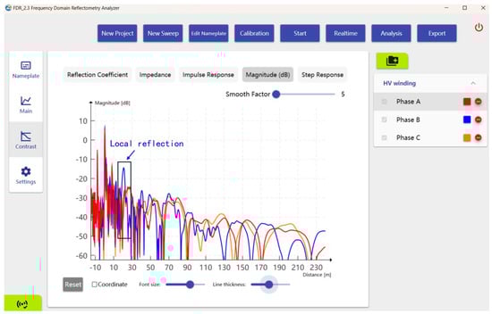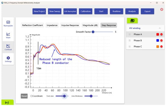 The FDR results obtained after the frequency to time domain conversion are shown in Figure 11 and Figure 12. The step response result shows that the Phase B trace started to deviate from the other two phases at 16 m, and the conductor length became shorter. This was a clear indication of the turn-to-turn short. A prominent localized reflection peak could be observed from the magnitude response of Phase B.