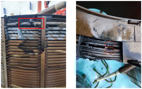 The transformer was designated for scrapping, which provides a good opportunity to verify the effectiveness of various testing techniques. After completing all the routine testing, the transformer tank was removed to visually inspect the winding condition. The Phase A and C windings of the HV side were intact, while flashover marks were found in the Phase B winding, as shown in Figure 17. The flashover location was on the first winding disk, physically about 15 m from the terminal. The turn-to-turn short fault was confirmed.