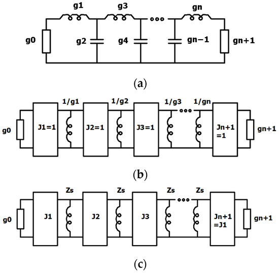 The general synthesis method is based on the approach shown in [17], where the design of directly connected-line filters was presented. The method relies on low-pass filter prototypes that are subject to lowpass-to-highpass transformations and Richard’s transformations, resulting in a bandpass microwave prototype filter (see Figure 1). Subsequently, a number of impedance inverters are introduced to convert the filter into a network in which only one type of element is present—either series open-ended subs or shunt shorted ones.