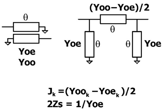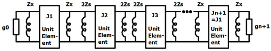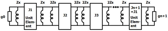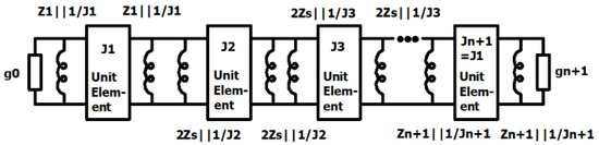 In narrowband filter design, narrowband inverters can be used. All remaining inverters can then be replaced with the quarter-wavelength transmission-line sections with characteristic impedances equal to 1/Jx. This method is suitable for filters with bandwidths up to 15%. A schematic diagram of such a realization is shown in Figure 6. In this case, condition (8) no longer holds due to distortions introduced by the unit elements. However, manual tuning of Zs can yield an equal-ripple response.