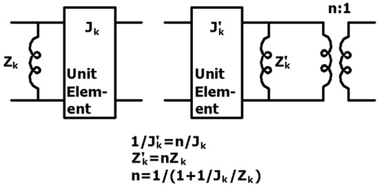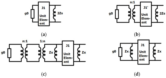 As shown, this identity allows the shorted stub to be shifted across the unit element, introducing an additional transformer. To maintain symmetry and obtain equal impedances one must split the stub impedance 2Zs into two values such that, after one is shifted across the inverter, both resulting stubs have equal impedance. The application of the third Kuroda identity is schematically shown in Figure 4. First, from the original circuit (Figure 4a), an additional transformer is extracted. Since it is connected directly to the resistive load, its effect is similar in nature to a unit element (which at the center frequency and for a resistive load, simply modifies the load value). To ensure the circuit response remains unchanged, the unit element’s value is accordingly modified.