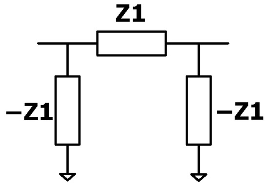 For broadband filter designs, broadband impedance inverters can be applied. Exemplary realizations of such inverters are described in [17]; they typically consist of a unit element with two shorted stubs that have negative characteristic impedance, as shown in Figure 7. With broadband inverters, bandwidths of up to 70% are achievable, with responses close to the ideal filter. As before, single-parameter tuning of Zs (Zx) leads to an equal ripple response. Condition (8) holds with negligible errors for bandwidths up to approximately 45%; above this value, manual tuning is required. Stub values are calculated as a parallel connection of the Zs (Zx) and inverter values Jk: