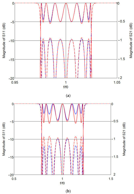 Calculated frequency characteristic of the 7th-order parallel-coupled filter using the proposed method (red lines) and the commonly known method described in [19], Section 8.09 (blue lines) for the narrowband case (B = 5%) (a); and the broadband case (B = 50%) (b). Solid lines—magnitude of S21; dashed lines—magnitude of S11.