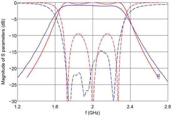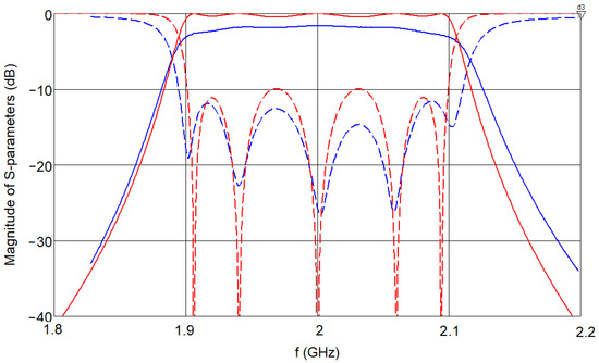 Calculated (red lines) and measured (blue lines) frequency responses of the 3rd-order parallel-coupled filter with the electrical parameters listed in Table 3. Solid lines—magnitude of S21; dashed lines—magnitude of S11.