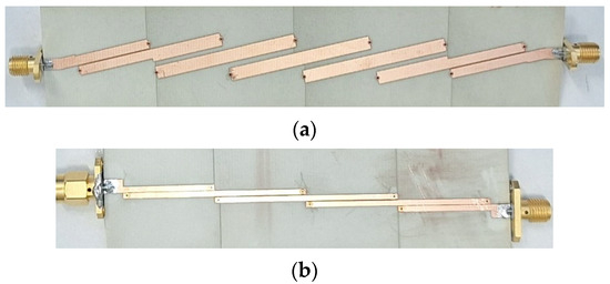 Photographs of the fabricated filters with shorted parallel-coupled sections. The 5th-order filter designed with the narrowband approach (a), and the 3rd-order filter designed with the broadband approach (b).