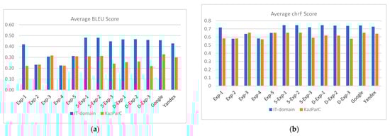 However, on the KazParC test set, out-of-domain setups such as the Exp-3 outperformed the Exp-1, confirming that performance was closely related to domain matching between training and test data. Cross-domain testing (e.g., the IT-trained model tested at KazParC) showed reduced scores, emphasizing the difficulty of generalization in domain-adapted NMTS.