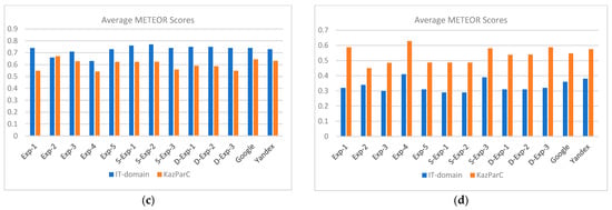 Figure 1. Comparative analysis of translation performance metrics across test sets: average BLEU scores (a), average chrF scores (b), average METEOR scores (c), and average TER scores (d). The bar charts illustrate Exp-1’s strong performance on the IT-domain dataset and Exp-3’s advantage on KazParC, with triplet-based models consistently outperforming the non-triplet baseline (Exp-4).