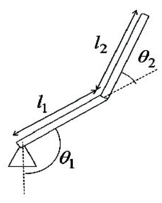 The outputs of the system are the joint angles of the first and second links, denoted by and , respectively, where