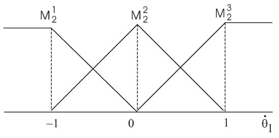 The workspace is defined as follows: . For this example, we employ five membership functions for the position variables and three for the velocity variables. Figure 3, Figure 4, Figure 5 and Figure 6 display the membership functions for , respectively.