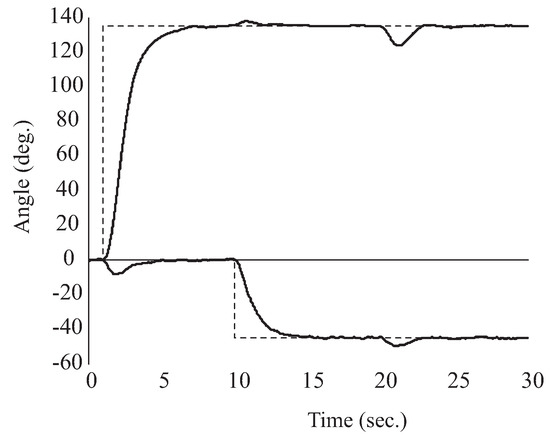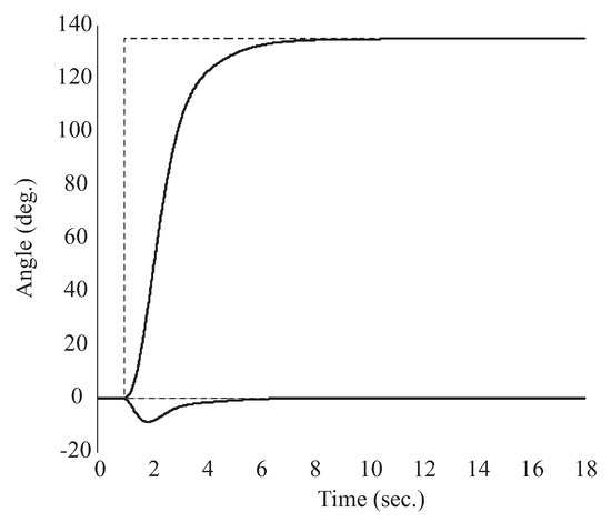 The setpoint is initially set to at 1 s, and then changed to at 10 s, starting from zero initial conditions. The transient response of each robot joint is shown in Figure 9.