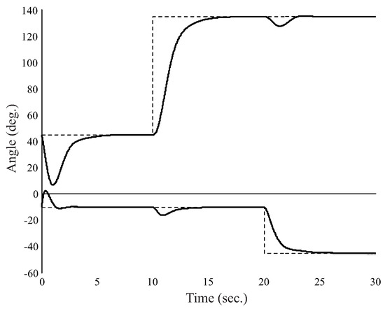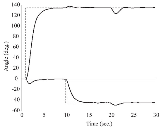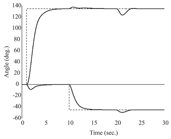 The setpoint is set to at 1 s, and then changed to at 10 s, starting from zero initial conditions. At 20 s, the robot is subjected to a load of kg and measurement noise in the angle with standard deviation . Figure 11 depicts the transient response of the two-link robot.