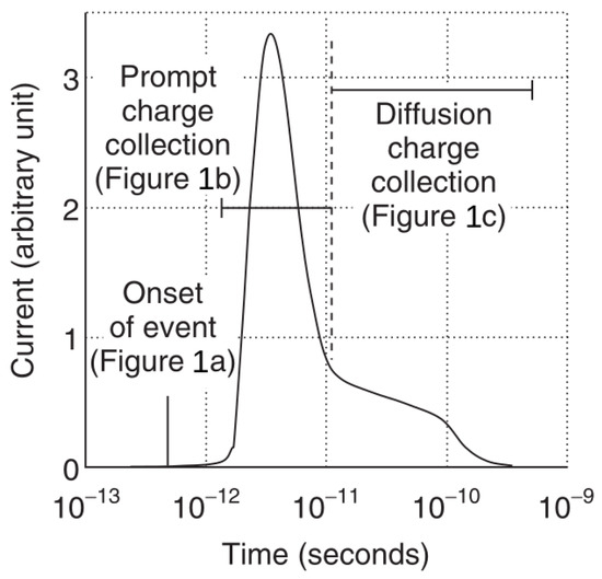 When a charged particle passes through the reversed biased PN junction of a transistor device, an SET fault is generated. The physical phenomena describing the fault can be divided into three main phases [2], as presented in Figure 1. Firstly, through the passage of the charged particle, the electrons in covalent bonds of the silicon crystal are ionized, as presented in Figure 1a. The passage of the charge particle creates new electron–hole pairs, charge carriers, that would usually recombine, and no significant effect would be felt. However, due to the electric field present at the PN junction, the carriers are quickly captured before recombining, generating a drift current, as illustrated in Figure 1b. Finally, an ion diffusion happens because of the carrier imbalance created on the junction due to the drift current, as presented in Figure 1c. It promotes the balancing of the charges and restores the device to normal behavior. The generated current is proportional to the charge collected by the transistor as the particle passes. Figure 2 shows the shape of the generated current. Two distinct features can be observed: a high and ephemeral peak and a long plateau that, although not high in amplitude, persists for a relatively long time.