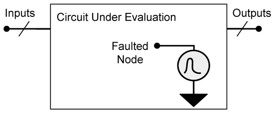 The geometry of the pulse should be configured in Quasar to explore different pulse models. In these approaches, the pulse is modeled as a current source. It is injected into the node to represent the current pulse generated by a fault that occurred in the devices connected to this particular node. This fault model is represented in Figure 3, which illustrates the circuit under evaluation and the fault node insertion within its internal nodes.
