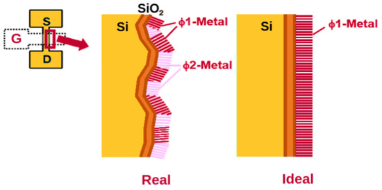 Metal Gate Granularity (MGG): The silicon lattice that composes semiconductors is not always perfect. This crystalline structure can vary, with some instances where a device has a higher granularity than other devices. This factor is especially important in the silicon-to-metal interface on the gate of transistor devices, comprising the MGG. Figure 4 presents a diagram of the interface and illustrates how the MGG of a real device differs from that of an ideal one. Its variation impacts the work function (WF) of the device, requiring more or less energy to free an electron from the material, which allows for conductance and significantly affects the Vth of a device [35]. In FinFETs and other multi-gate devices, the MGG, and thus the work–function fluctuation (WFF), is much more impactful than RDD, as these devices have low-doped channels [36,37].