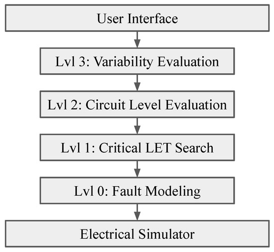 Figure 5 presents an overview of the layer model adopted in the Quasar development. It has four layers of abstraction: Layer 0, Fault Modeling, makes a single call to the electrical simulator and simulates a single SET fault; Layer 1, Critical LET Search, makes multiple serial calls to layer 0 to determine the minimal LET of a given SET configuration; Layer 2, Circuit-Level Evaluation, makes multiple parallel calls to layer 1 to gather all the minimal LETs of all SET configurations of a circuit, thus gathering all minimal LETth of the circuit; Layer 3, Variability Evaluation, makes multiple parallel calls to layer 2 to determine the LETth of a given circuit under certain variable parameters and integrates these with a predictor model to speed up the simulations. The development and concepts adopted in each layer are presented in the following sections.
