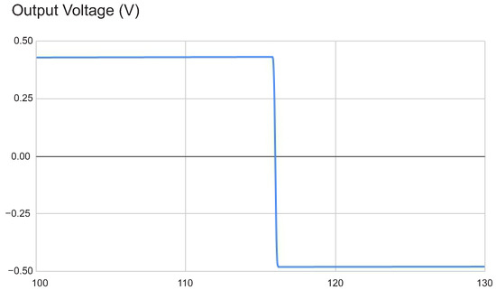 For a valid fault configuration, the shape of this function resembles a step, as shown in Figure 7. This occurs because, for low current values, the fault is electrically masked, resulting in no change to the nominal output voltage value. For sufficiently high currents, the fault propagates with sufficient intensity and width, causing the output voltage to be completely inverted.