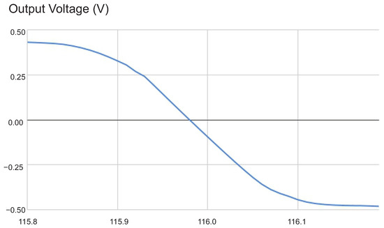Despite a tiny current fluctuation, the overall function is monotonic, either increasing or decreasing depending on the nominal output voltage. Figure 8 shows a zoom-in on the transition zone of the function of Figure 7. This sigmoidal shape is favorable for root searching as it approximates a linear function at the root.
