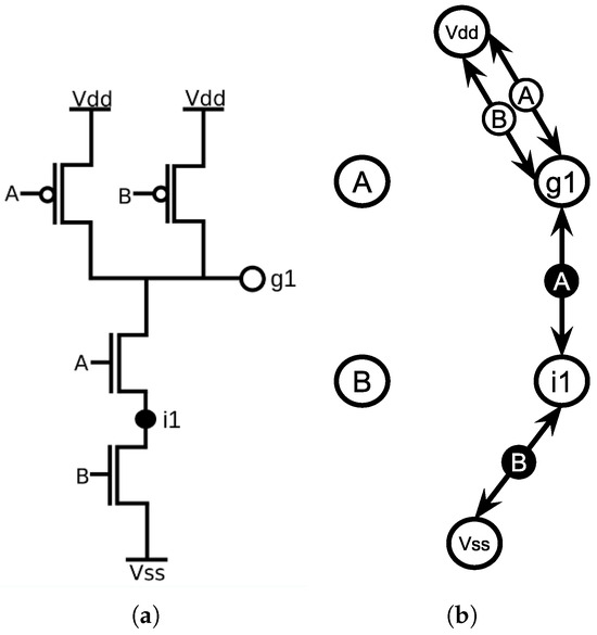 NAND2 Gate transistor topology and graph model. (a) Transistor arrangement; (b) Graph model.