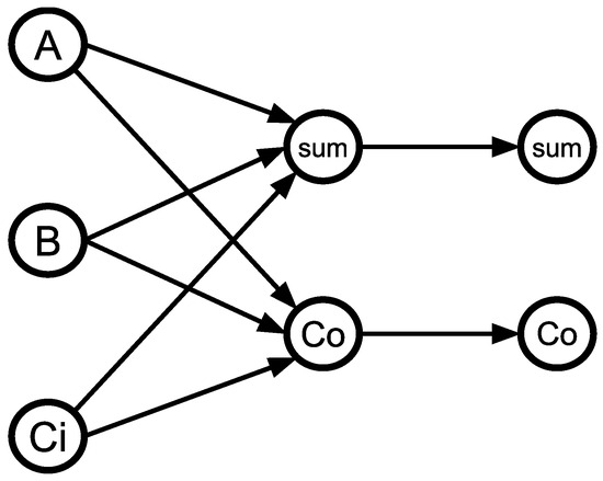 Another graph with a node representing each EPG is created. For every transistor in the circuit, an arc is created, going from the group containing the gate node to the group containing the source and drain nodes. For the Mirror Full Adder example, the results in the graph are shown in Figure 12, where each EPG is labeled with the name of one node in it. In the EPG graph, a Topological Sorting algorithm is run to provide the order in which the EPGs will be logically simulated. This order is crucial, as it ensures that the logical state of every transistor’s gate is determined before the states of its source and drain are even considered. If sorting cannot be carried out, there will be no logical validation; all fault configurations will be marked as unsafe and electrically validated.