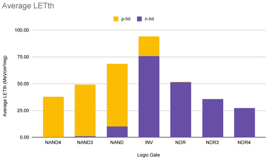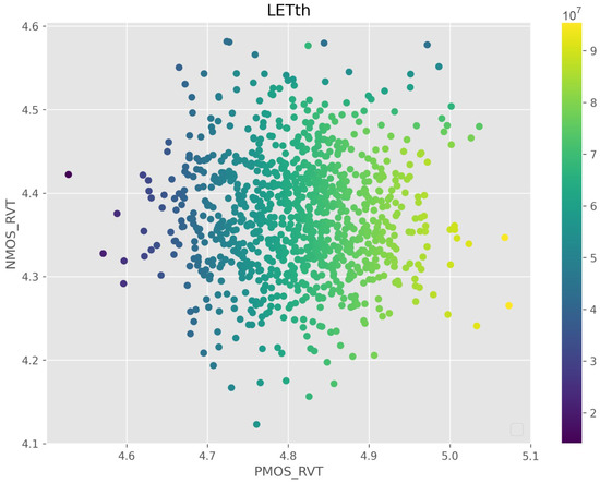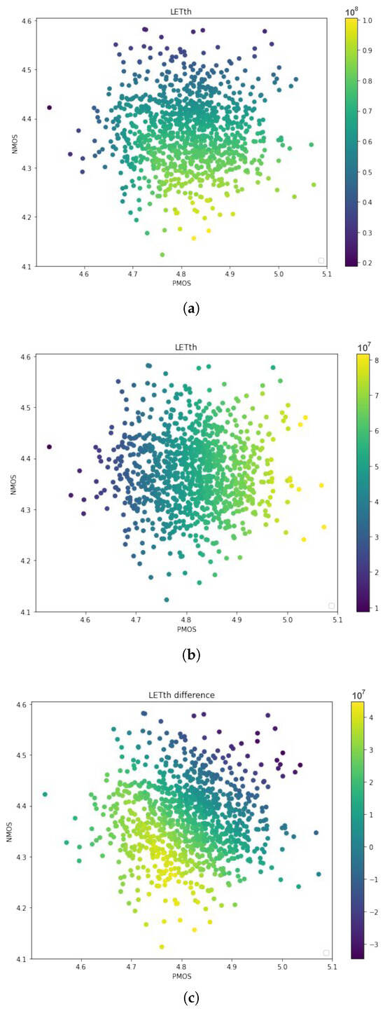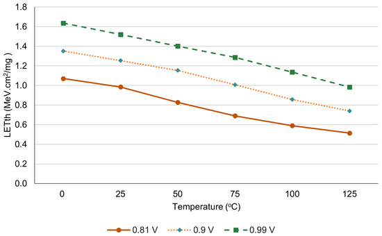 Finally, the impact on the LETth evaluation of temperature and voltage is described in Figure 21, which shows the expected result that higher temperatures reduce cell robustness, as well as causing a voltage reduction. This behavior is similar to that reported by [56] for XOR2 gates in other technology nodes.