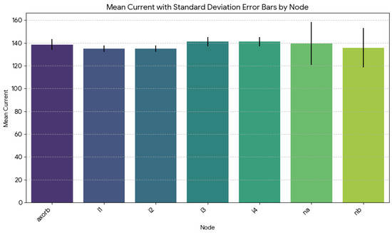 Node demands deeper discussion. These node results fall within the higher current range, making them relatively robust. However, it is worth noting that their standard deviation, as presented in Table 4, was significantly higher than that of the other nodes, suggesting greater dispersion in their robustness. Figure 20 presents the mean current, with standard deviation error bars for each node of the XOR2 cell evaluated.
