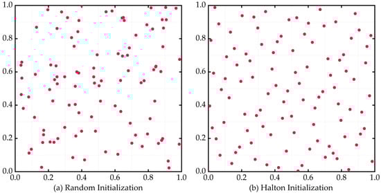 Assuming that the search space is two-dimensional, the generation process of the Halton sequence is as follows: firstly, two prime numbers are selected as bases, corresponding to two dimensions. Then, in each dimension, the interval (0, 1) is repeatedly sliced and taken in a roundabout way according to the selected bases, so as to obtain a set of non-repeated and uniformly distributed points. The mathematical model of the slicing process is shown in Equations (28)–(30):