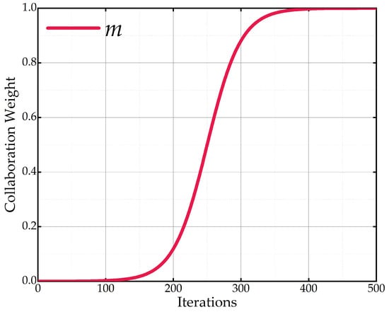 where m is a dynamically varying weight coefficient based on the sigmoid function, and its iterative value is shown in Figure 3. The value of m gradually increases with the number of iterations, indicating that the algorithm is more inclined to rely on random cooperation for extensive exploration in the early stage, while gradually enhancing the dominant role of the global optimal solution in the search process during the later stage, thus guiding the algorithm to smoothly transition from the random search in the early stage to the refined convergence process in the later stage. This strategy not only enhances the global search capability, but also maintains a certain local search capability by weighting the global optimal solution for location updating.