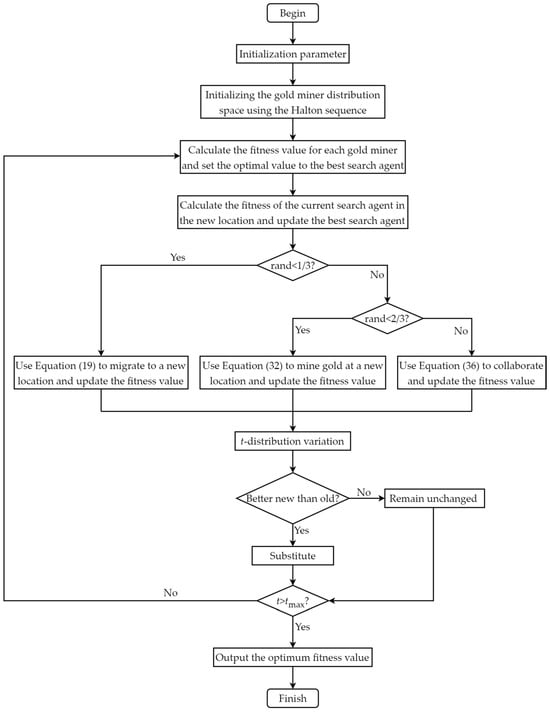 Step 5: Use one of the methods among Equation (19)—migration, Equation (32)—gold mining, and Equation (36)—cooperation to calculate the new location of the search agent and update the fitness value;