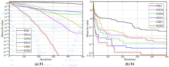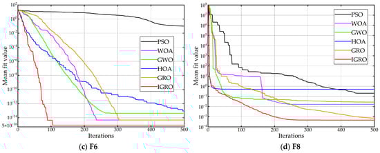 In order to verify the effectiveness of the IGRO algorithm, this study used 10 benchmark functions as test objects and solved the 10 benchmark functions using PSO [], WOA [], GWO [], HOA [], and GRO, respectively. The names, definition domains, and theoretical optimal values of the test functions are shown in Table 1. Among them, F1–F4 are single-peak test functions, and F5–F10 are multi-peak test functions. The diversity of test functions can fully reflect the search performance of the IGRO algorithm.