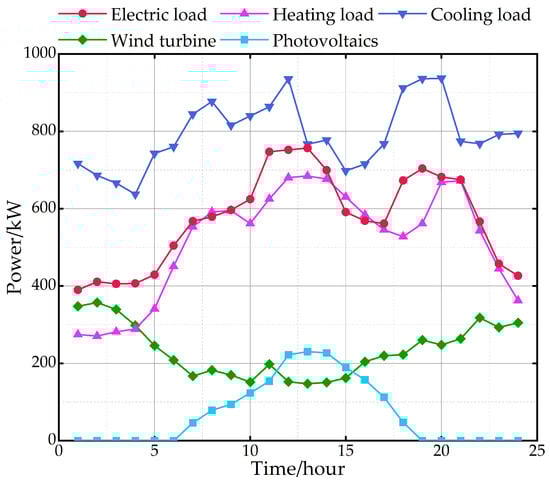 The time-of-use electricity price parameters are shown in Table 3 []. The emission factors and treatment cost parameters of the pollutant gases generated by the combustion of natural gas and the purchase of electricity are shown in Table 4, the maintenance parameters of each piece of equipment are shown in Table 5, and the typical daily load and predicted power of WT and PV are shown in Figure 6.