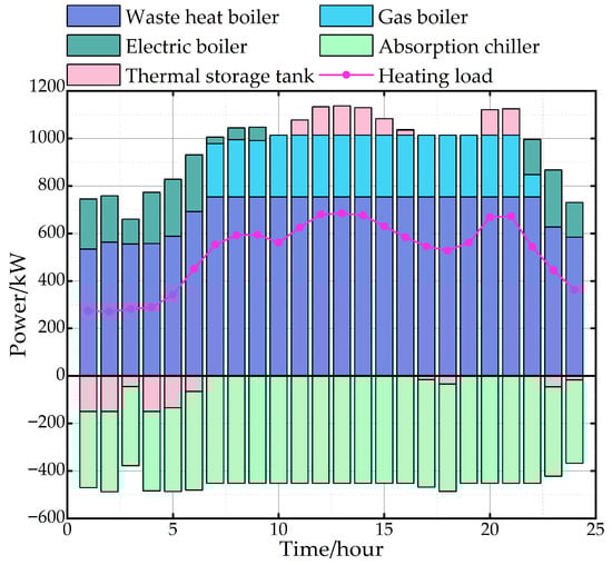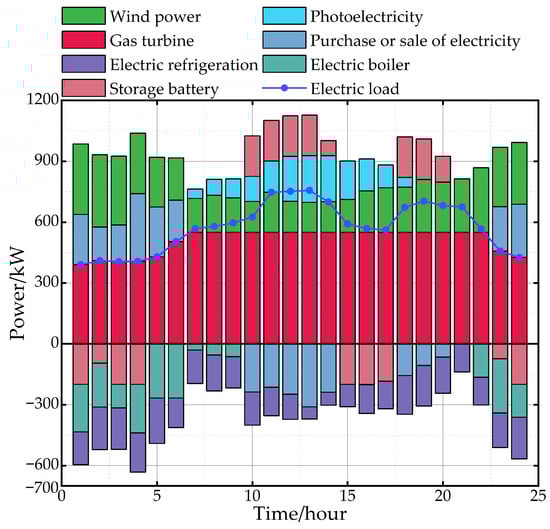 Figure 7, Figure 8 and Figure 9 show the optimal scheduling results for electrical, thermal, and cooling energy on a typical day of microgrid operation. In Figure 7, the gas turbine generates a significant share of the electricity, while the battery storage system is controlled to charge and discharge at different time intervals to support the power supply. During the nighttime hours between 1:00 and 4:00, the storage batteries switch to charging mode due to the low power demand, while electricity is purchased from the grid to meet the requirements of other electrical equipment. During periods of peak electricity demand, the batteries discharge stored energy to effectively alleviate pressure on the power grid, while also selling surplus electricity back to the grid to maximize economic returns. The electric boiler and the electric refrigeration consume electricity to meet the heating and cooling loads of the system, thereby contributing to stable and efficient energy system operation. From 7:00 to 9:00, since the heating cost of the gas boiler is higher than the revenue from selling electricity, the electric boiler consumes some of the electrical energy to produce heat. From 15:00 to 17:00, the storage batteries store surplus electricity to be discharged during the next period of peak electricity demand.